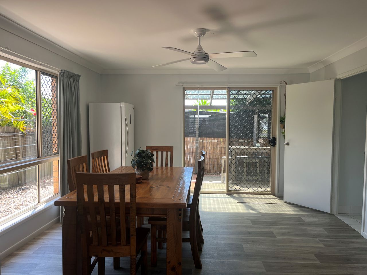 The lower floor has an open plan living area with a smart TV. The kitchen and dining area opens out onto the covered, outdoor entertainment space which has a gas BBQ and outdoor setting. The kitchen is equipped with all the basics for a family beachside holiday including a dishwasher, oven and an extra fridge in dining room.