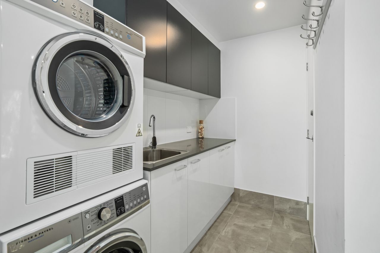 - Large Fisher and Paykel front loader washing machine and dryer in laundry prep room off the kitchen