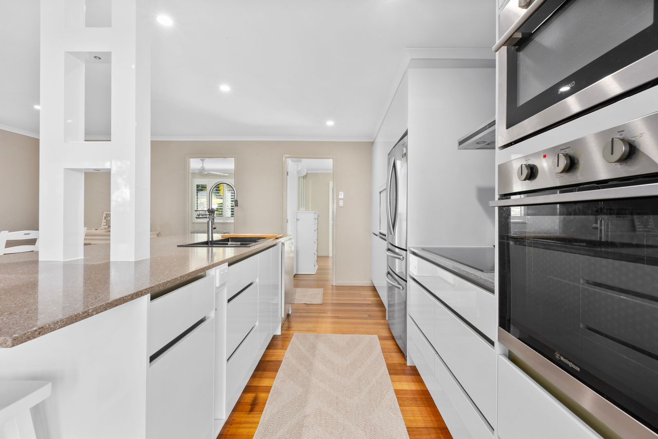 The galley kitchen is equipped with stone island bench, breakfast bar, large double sink, and modern appliances such as dual wall ovens, induction cooktop, dishwasher, microwave, rangehood and an abundance of storage.
