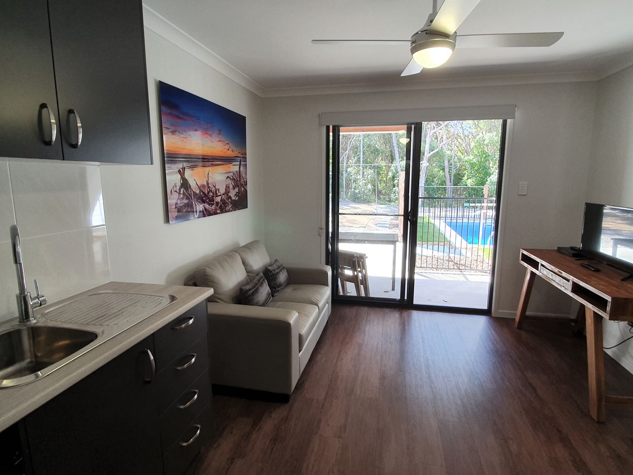 • Living entertainment area with TV and access to swimming pool