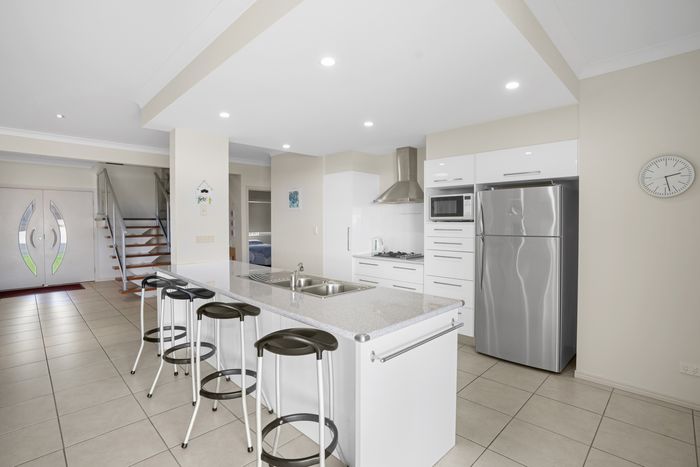 - Kitchen with island bench, four burner gas cooktop and dishwasher