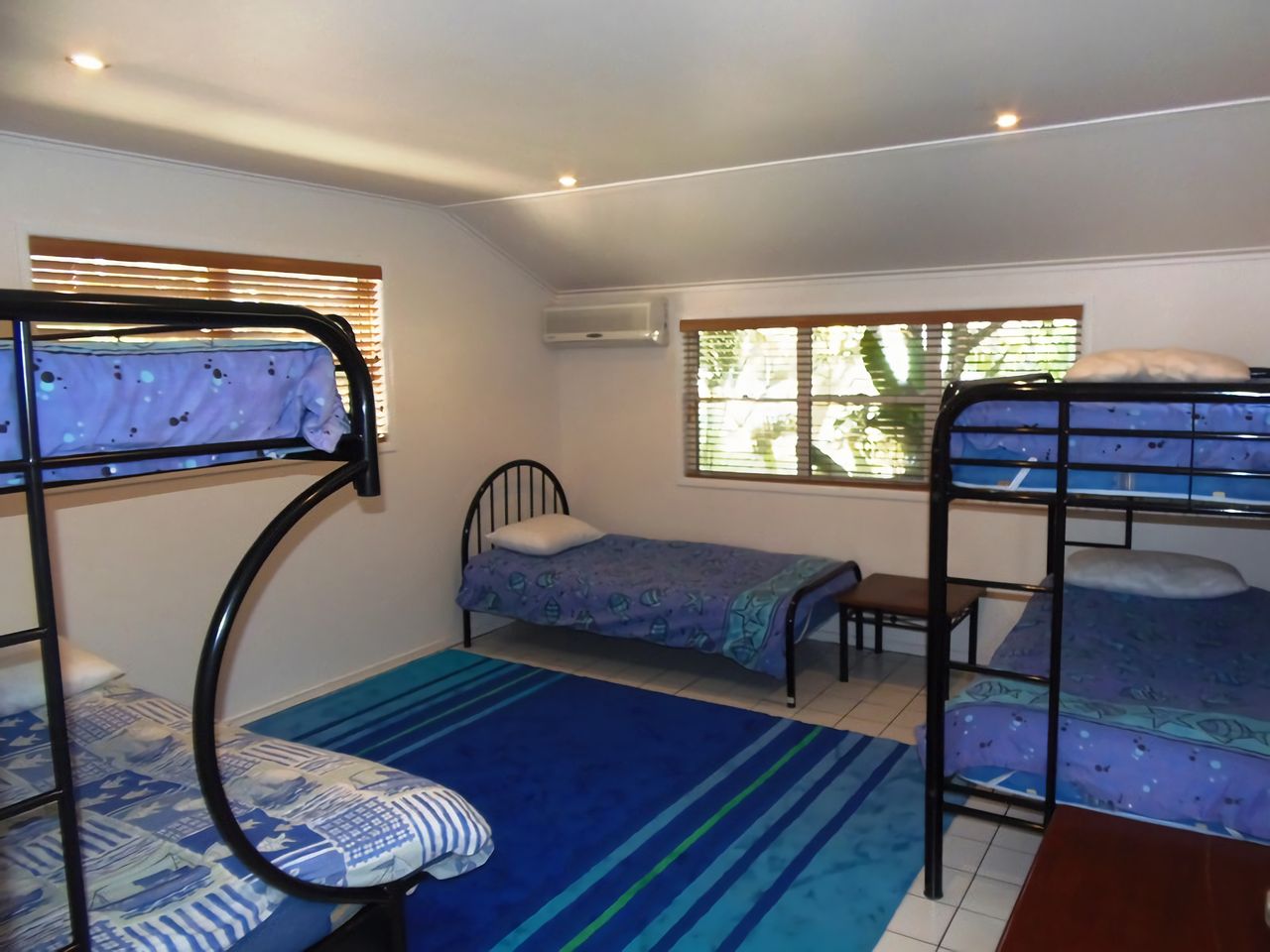 Sleeps eight in one x queen bed, one x single bed, one x double bunk and one x bunk with double on bottom and single on top.